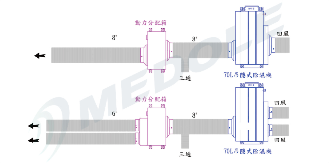 當風管型設備(例:除濕機)因管線太長而造成風量不足的時後,可搭配動力分配箱,來維持風量持續性。